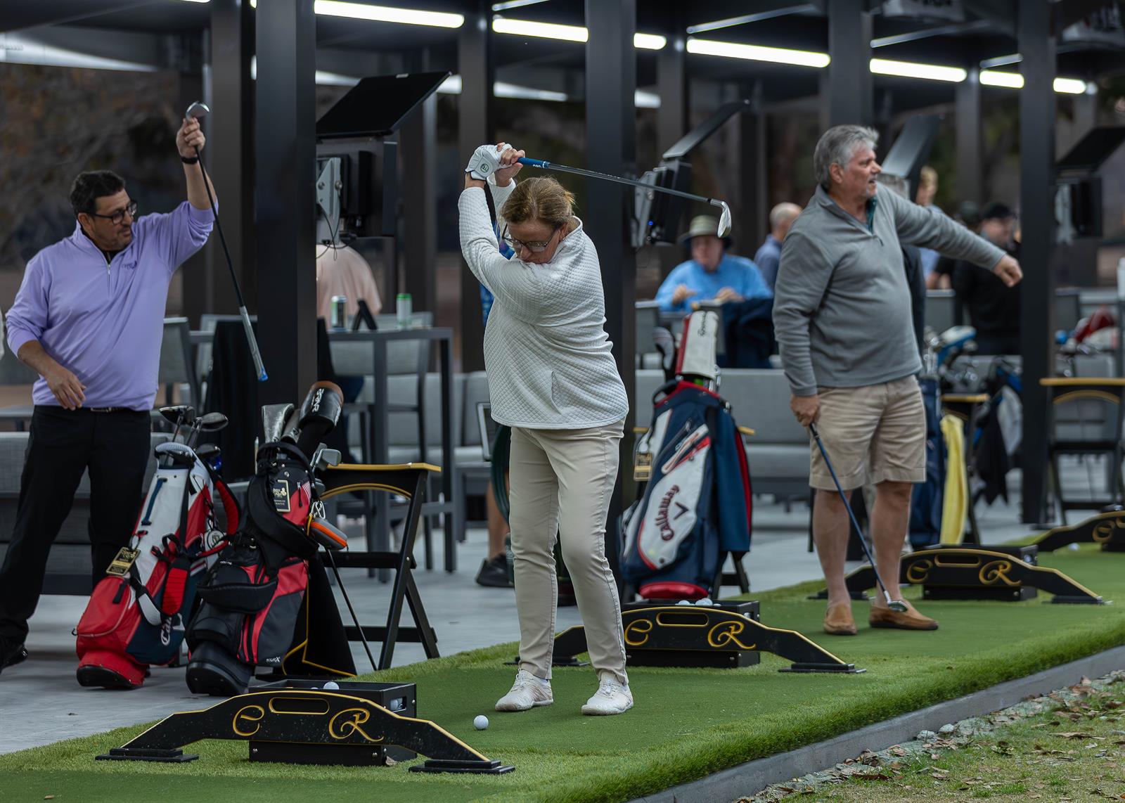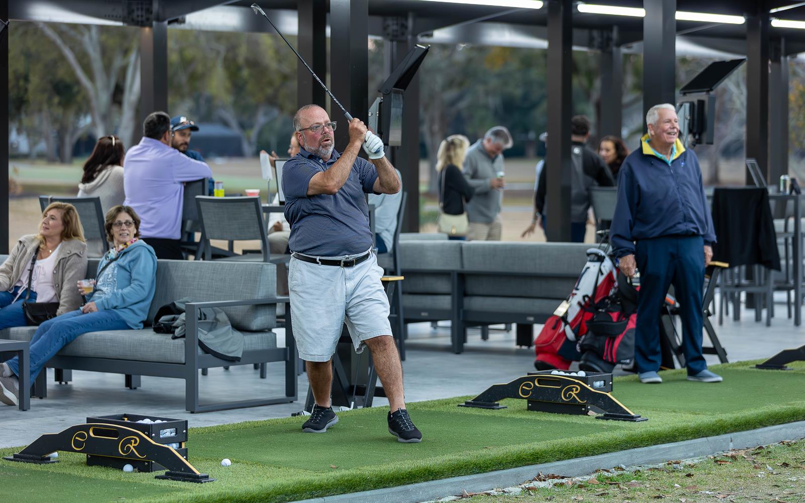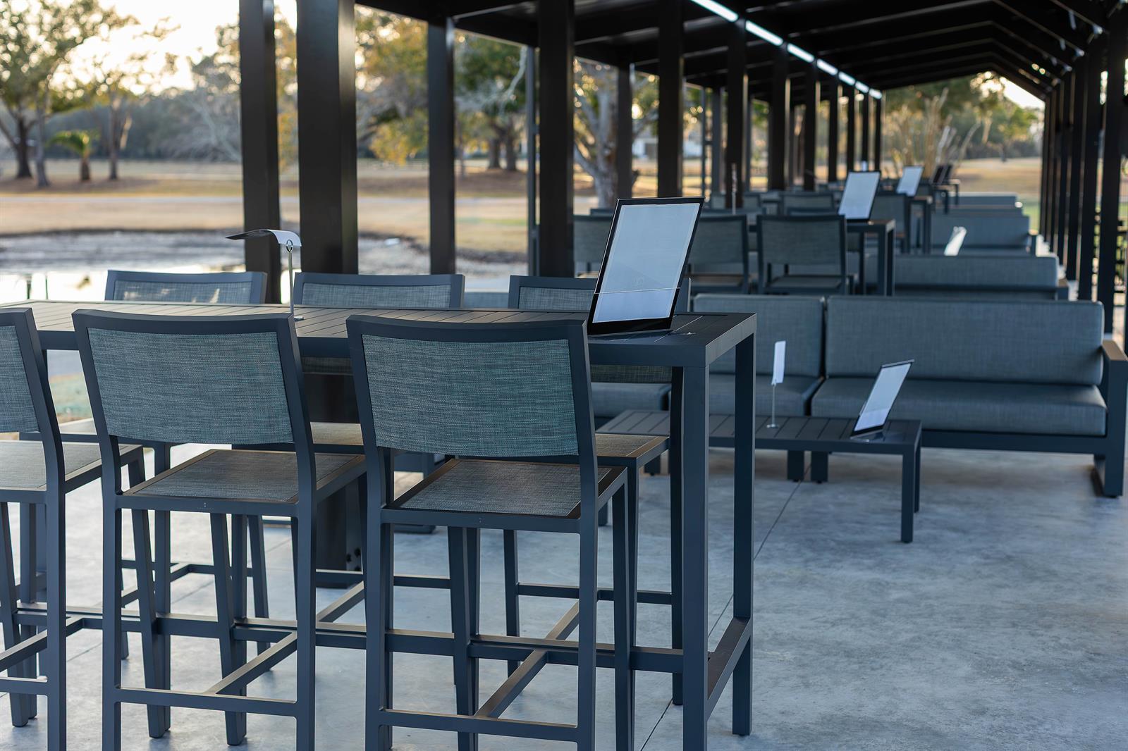 covered, comfortable hitting bays, lounge seating, televisions, food and